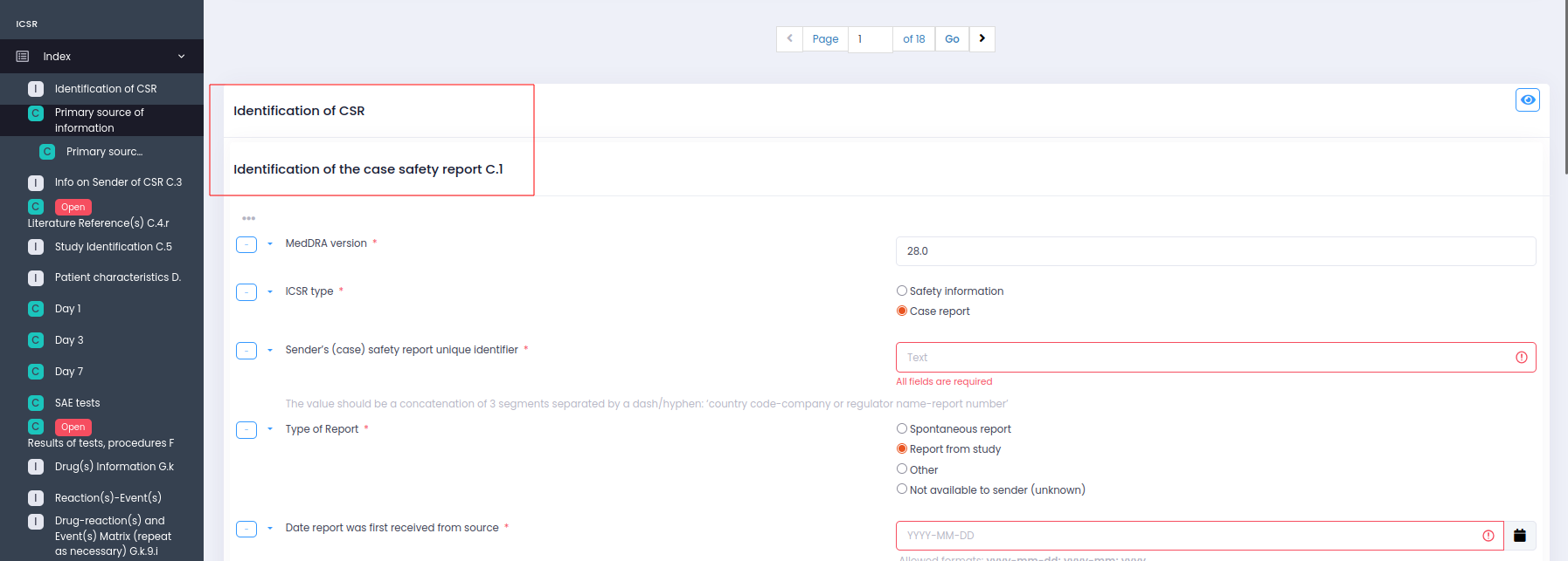 When I try to do an E2B xml export of a file it keeps giving me an error in a field in the N.1 Module - how to resolve this? This module has a peculiarity: it is setup in a way that all of the questions are hardcoded to be connected and are essential ...