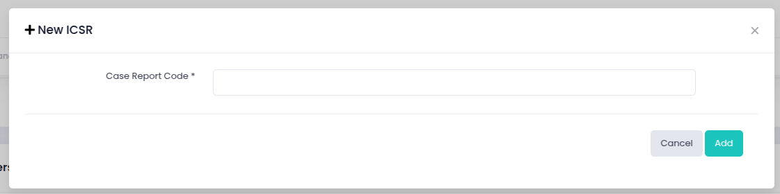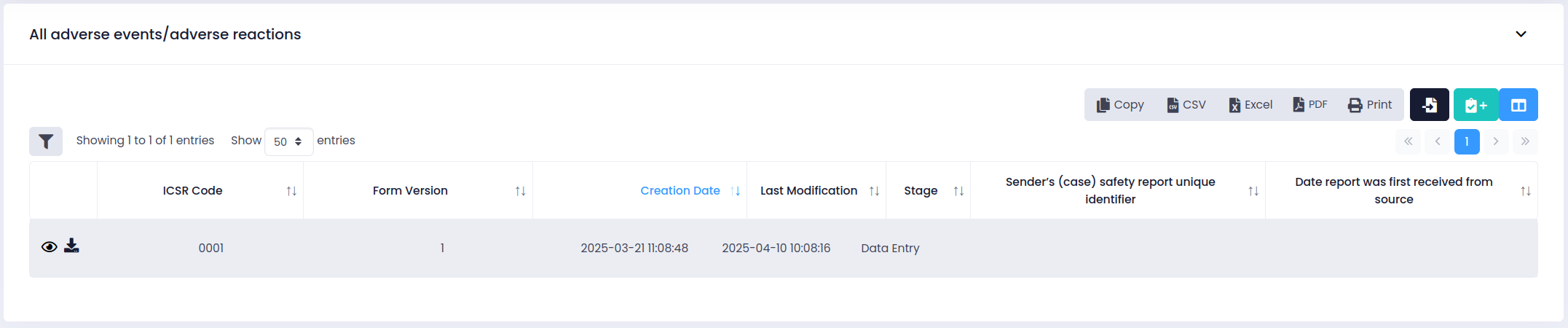 After adding the Case Report Code of your choice, click "Add" and your new ICSR will be created and displayed in the table "All adverse events/adverse reactions" (columns will be displayed according to your ICSR configuration):