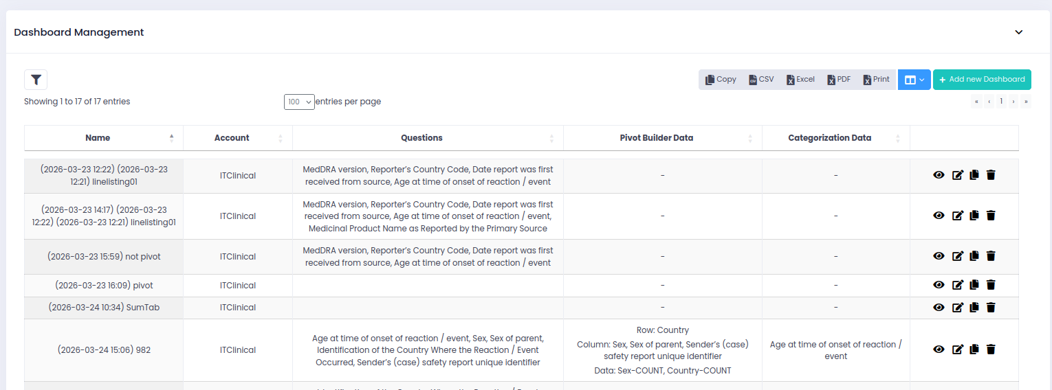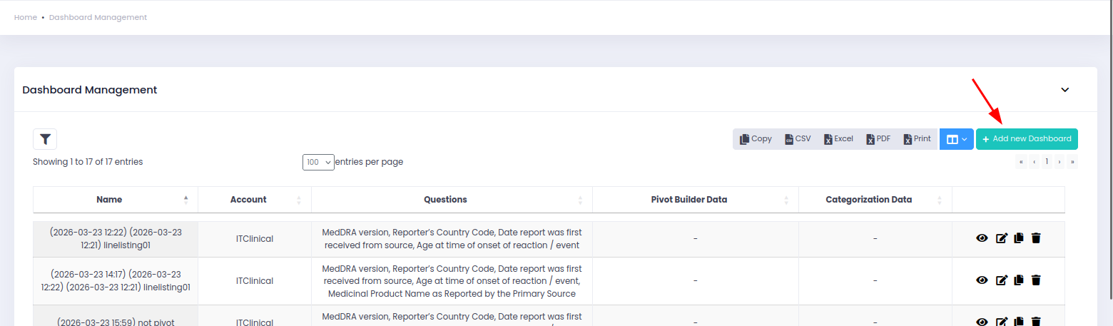 the symbols in front of each dashboard are actions you can take (from left to right): view, edit, clone and delete: