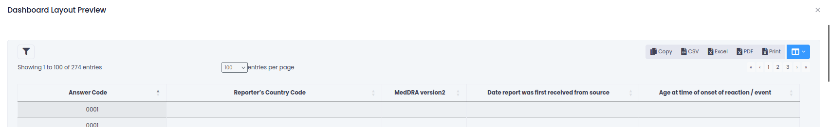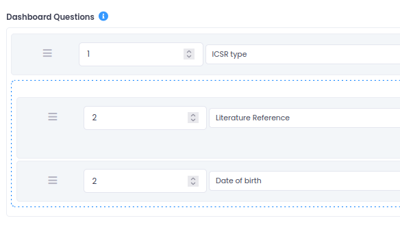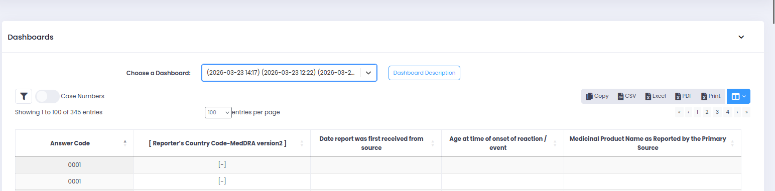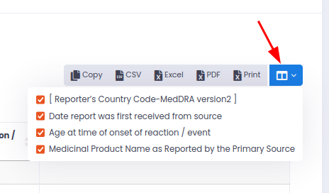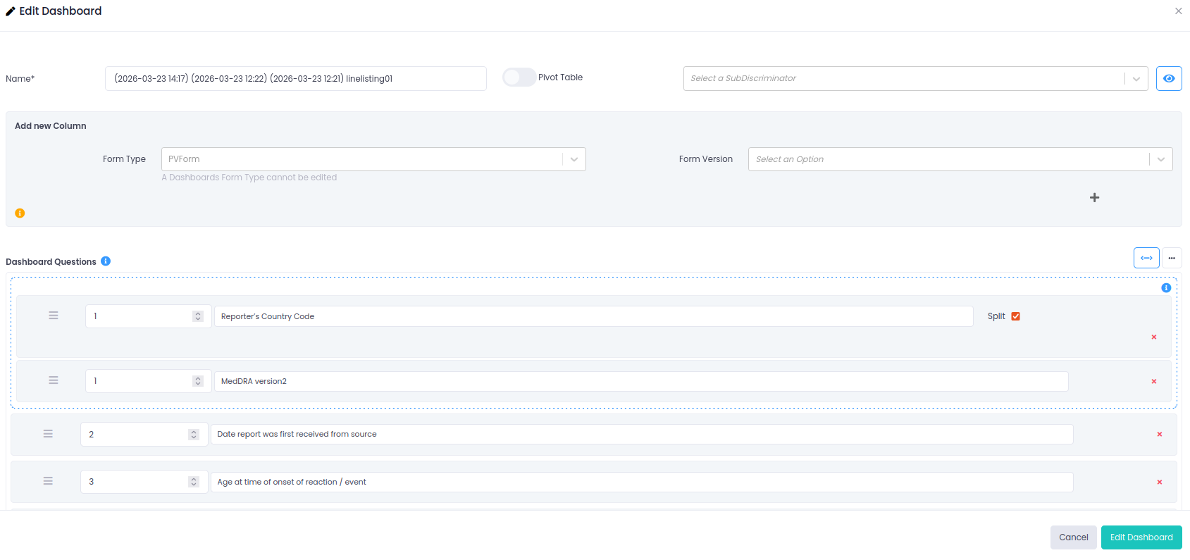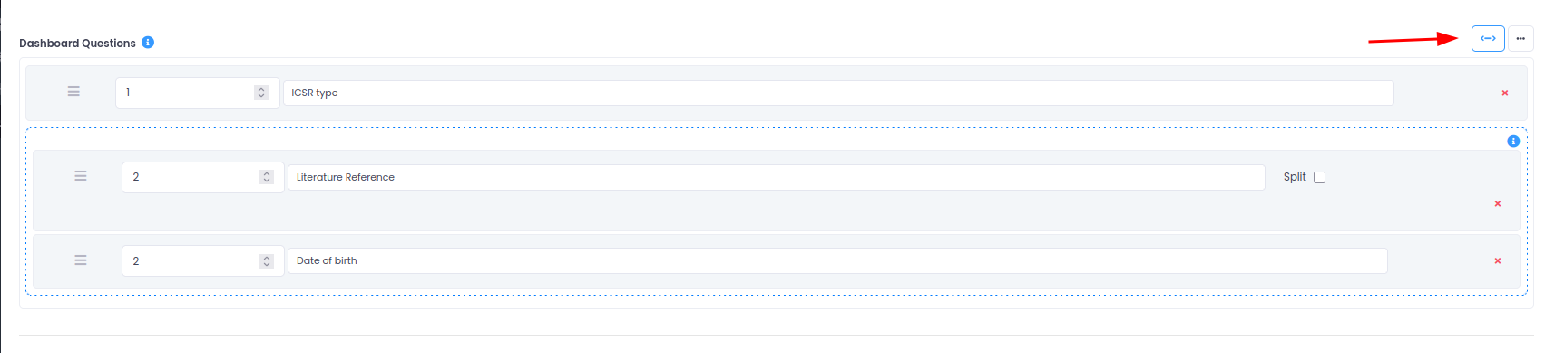 Questions are aggregated by ICSR by default (meaning if an ICSR has for example 15 drugs, in the dashboard table, you will only see one row), but sometimes you can split some ICSRs by rows if they have questions that belong to a module and/our group which is repeatable - you can do this by checking the "Split" case, as below: