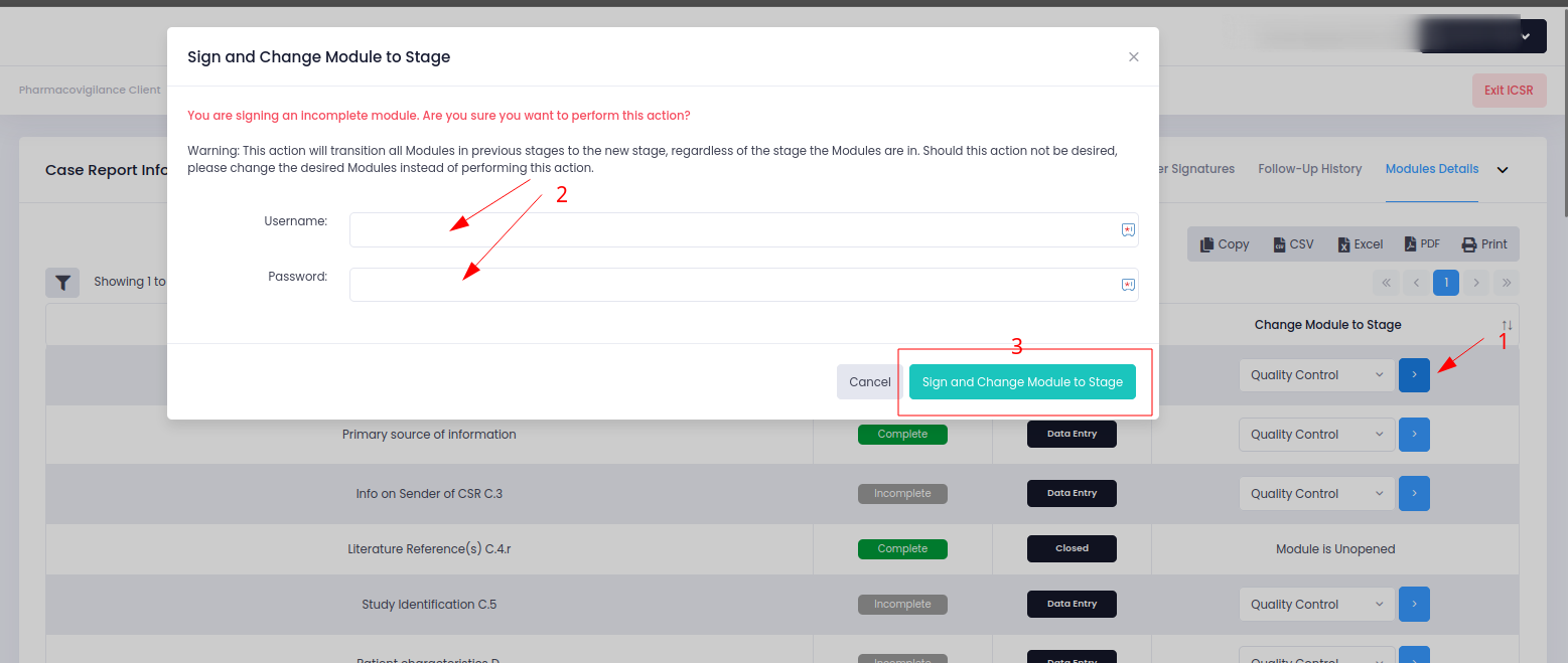 Now click on the blue arrow (1) which will open a pop-up where you put in your credentials (2) and finally sign the stage transition (3)