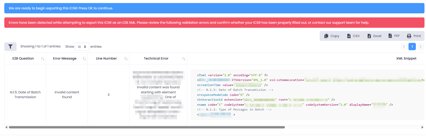 When I try to do an E2B xml export of a file it keeps giving me an error in a field in the N.1 Module